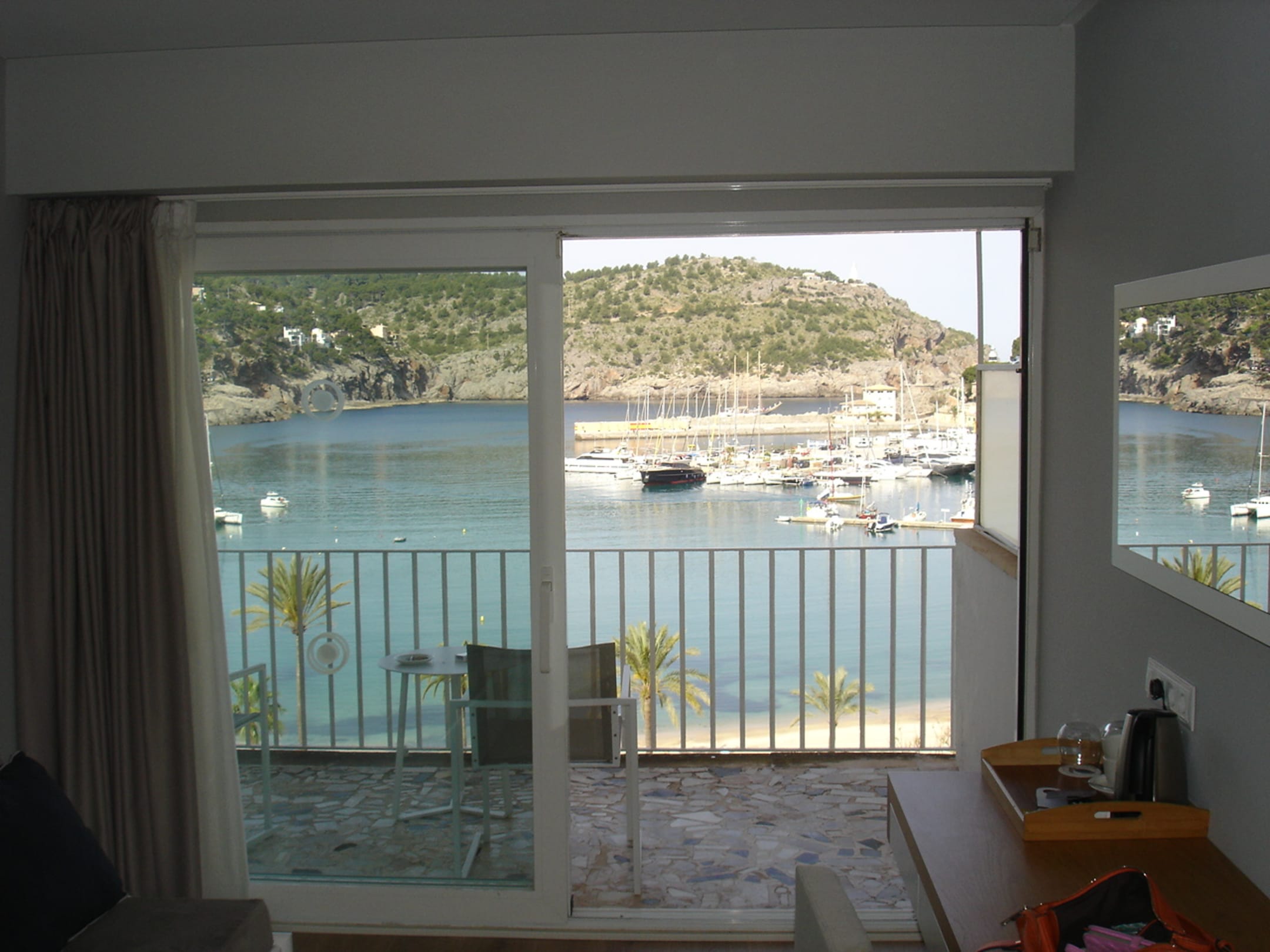 Blick aus unserem Zimmer zum Balkon und auf die Bucht