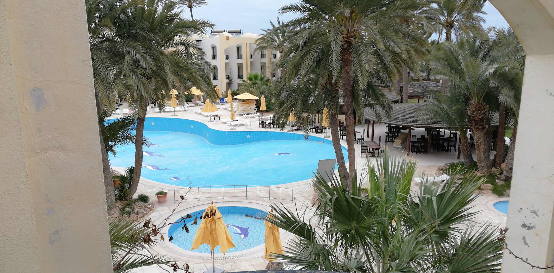 AusblickAusblick vom Balkon. Der große Pool wurde gerade renoviert. Der kleine runde davor ist für kl. Kinder. Natürlich im März viel zu kalt und nun leer. Links neben dem Grossen, wäre noch ein kleiner (hälfte vom grossen) der ist beheizt und wurde benutzt.