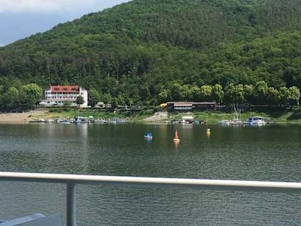 Blick von der Sperrmauer aufs Hotel.