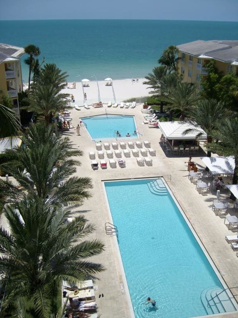 Bild zeigt die beiden Pools sowie den im Hintergrund beginnenden Strand. Links und rechts der Palmen am Bildrand weitere Suiten in den Nebengebäuden.