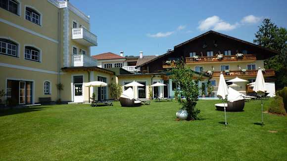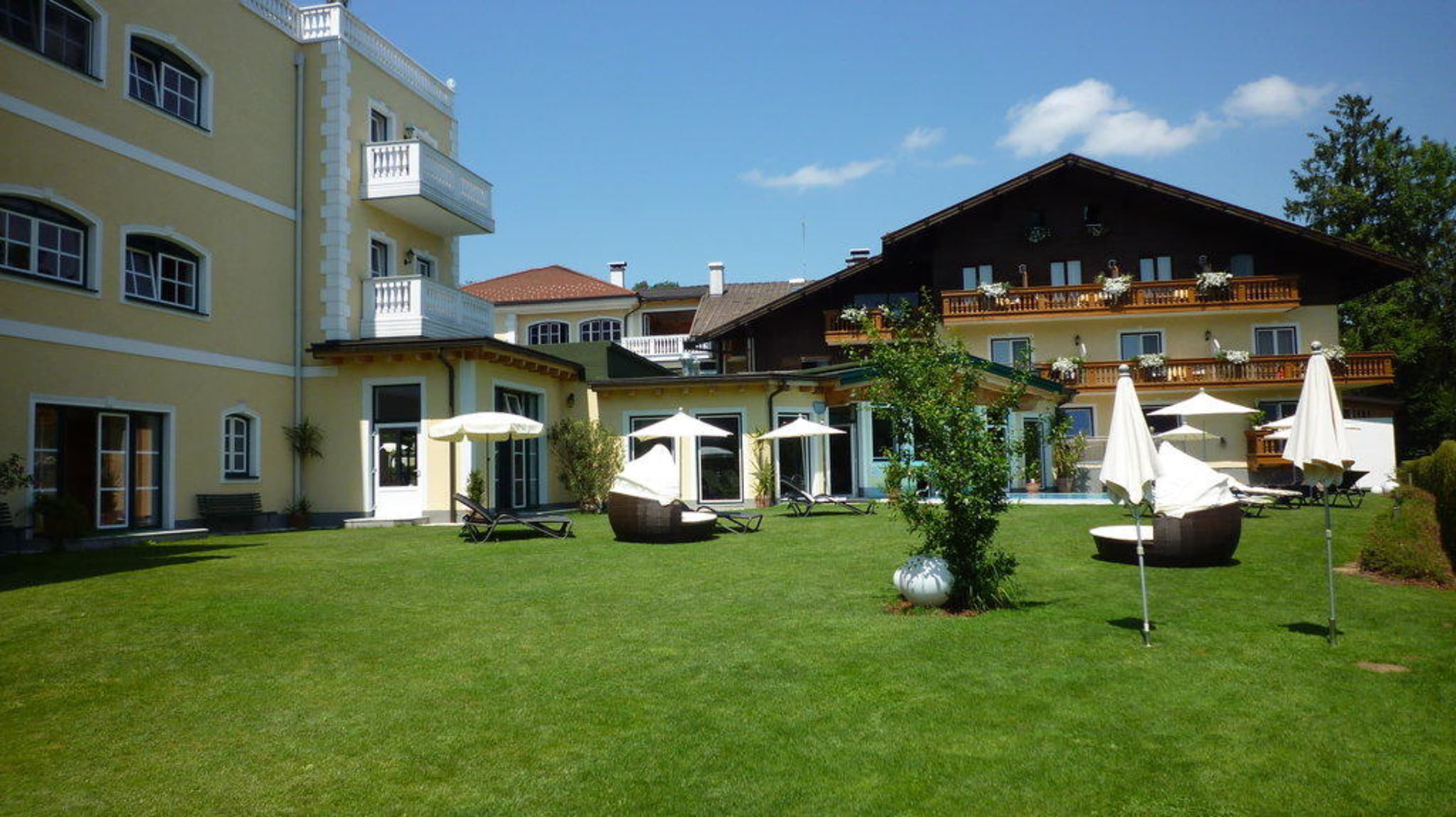 Liegewiese am Pool; links Marienschlössl, geradeaus Stammhaus