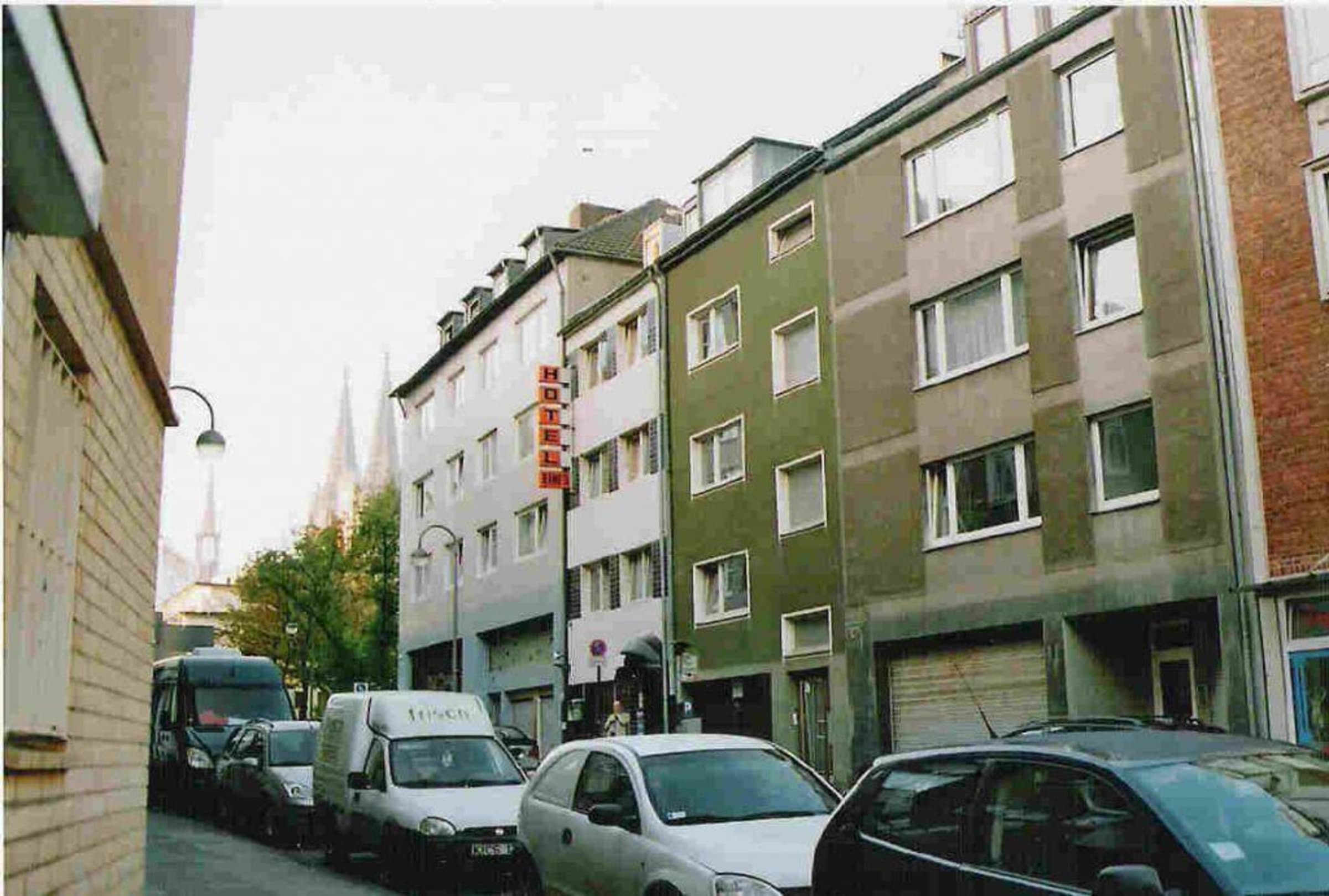 Hotel Einig und die JohannisstrasseDas kleine Hotel befindet sich in einer sehr ruhiger Seitenstraße. Das weisse, enge Gebäude mit orange-farbigen Schild ist ziemlich unauffällig. Der Dom ist nicht weit entfernt - man kann dessen Turme im Bild sehen.