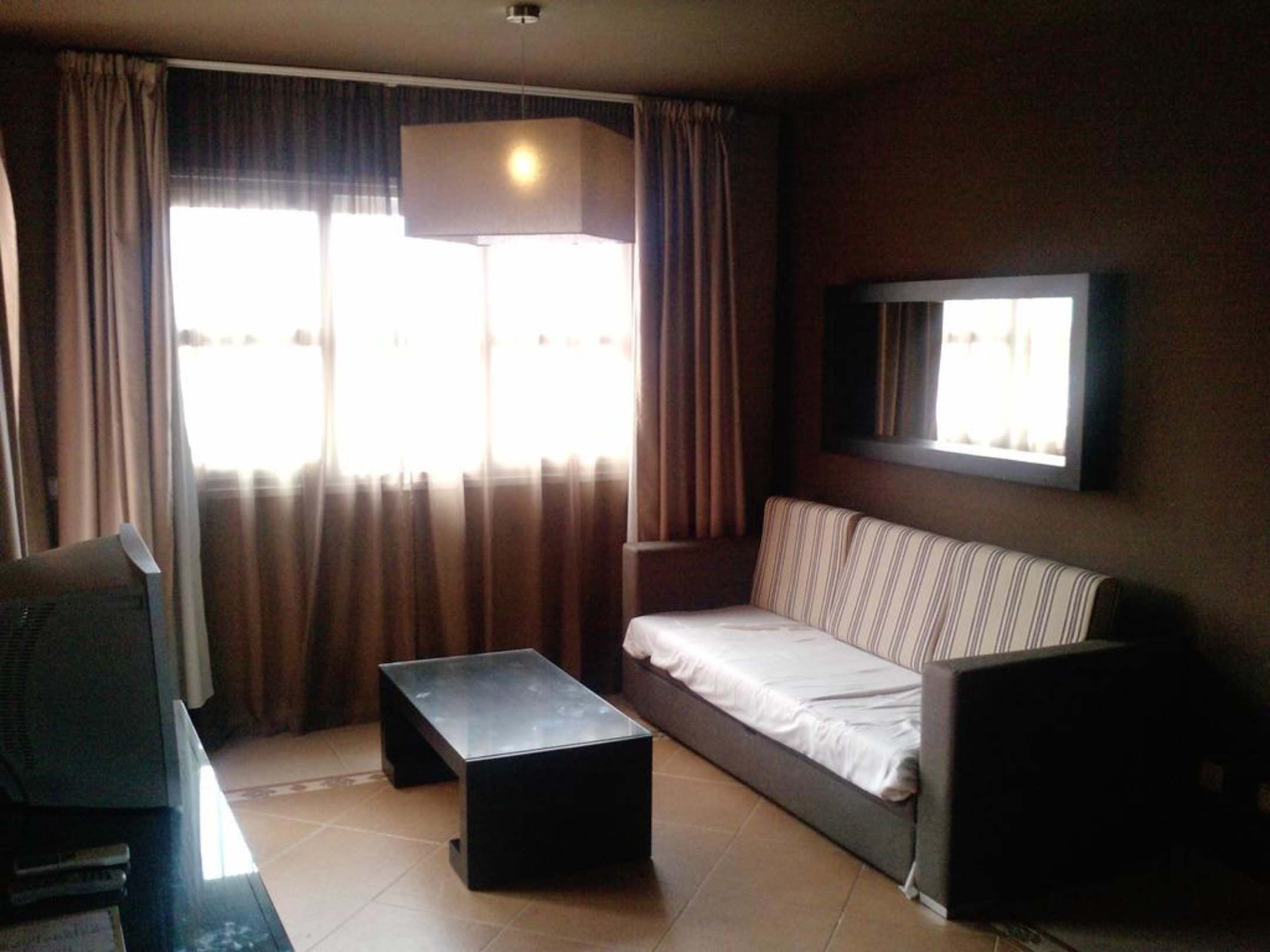 Für mich leider zu dunkel gestalteter Wohnbereich. Das gesammte Appartment ist in solchen Brauntönen gestaltet. Das macht es nicht gerade romantisch.