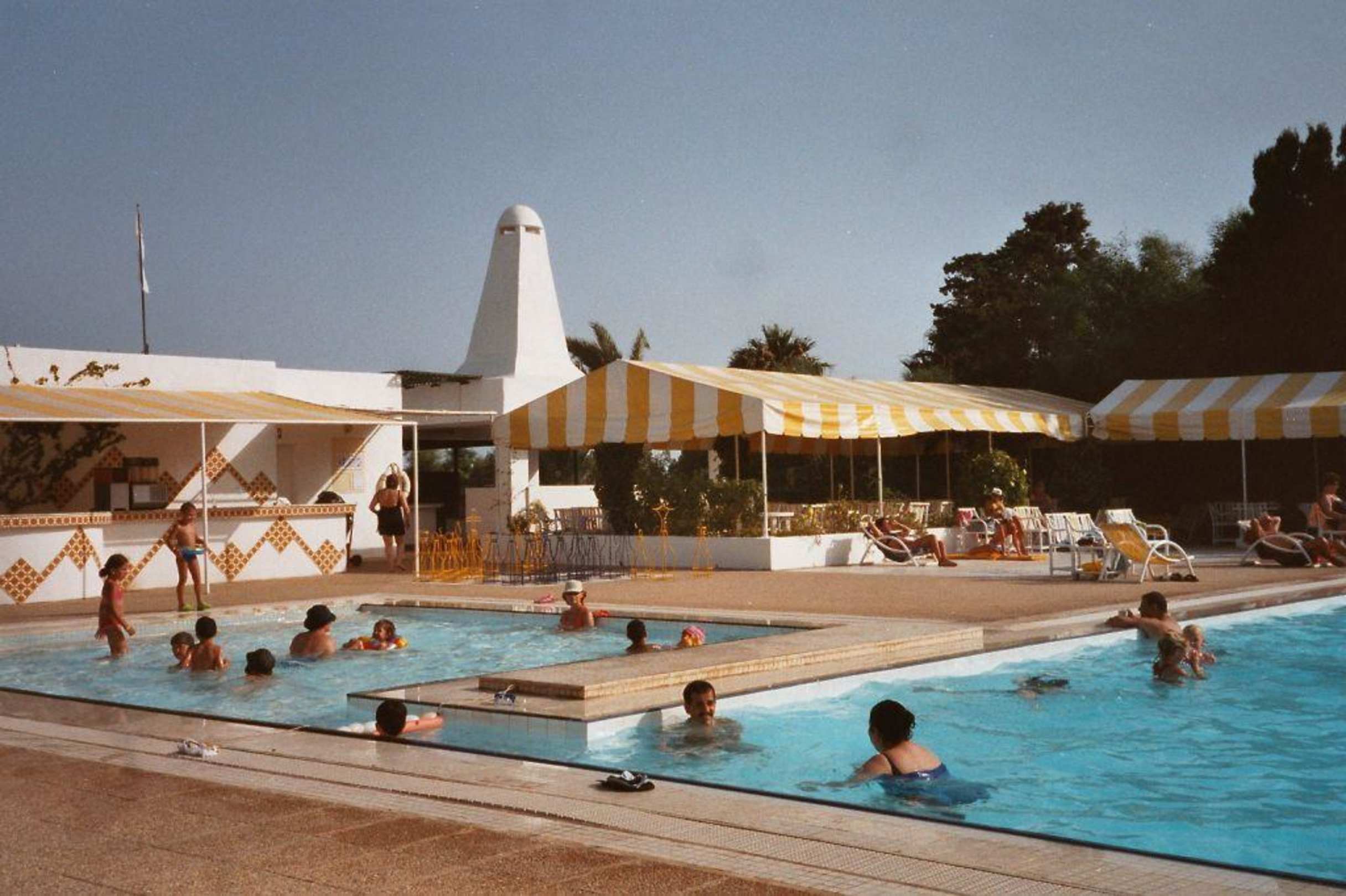 Vue sur la piscine avec le bar et restro barbequeagreable piscine en pleine air avec bassin pour les jeunes enfants.