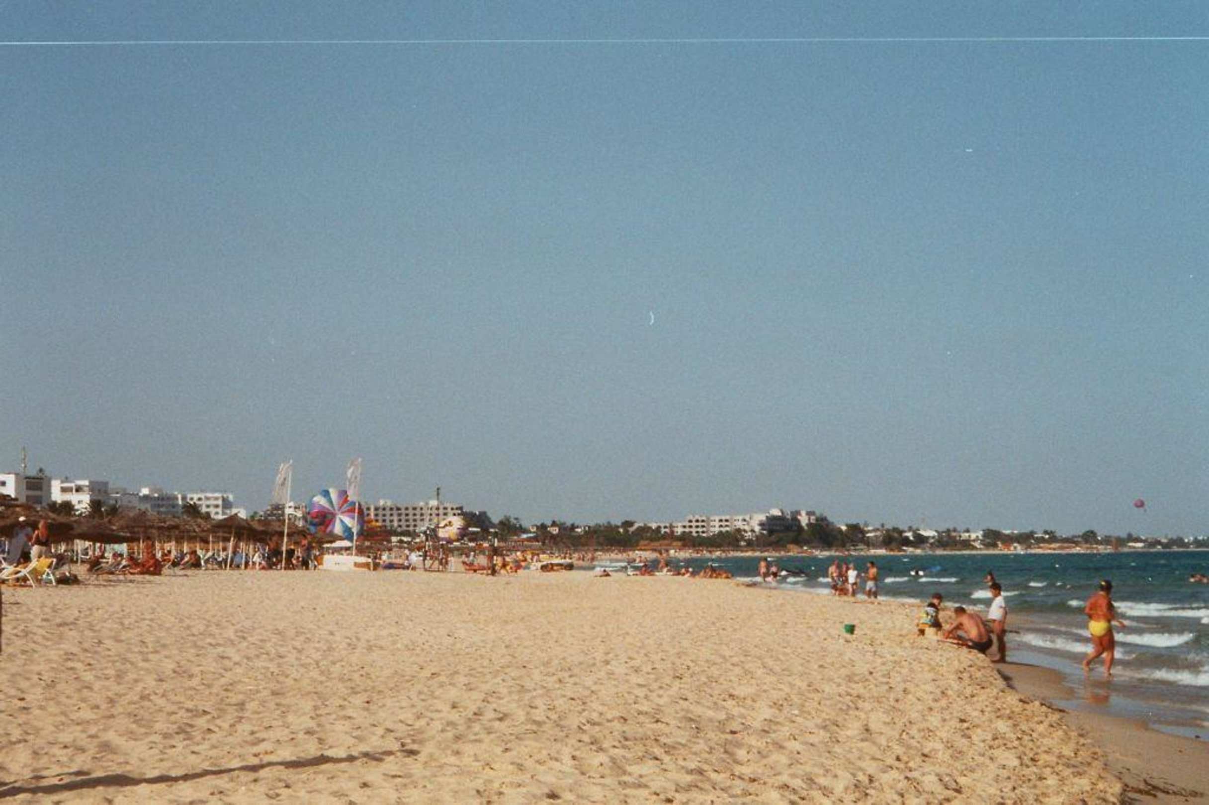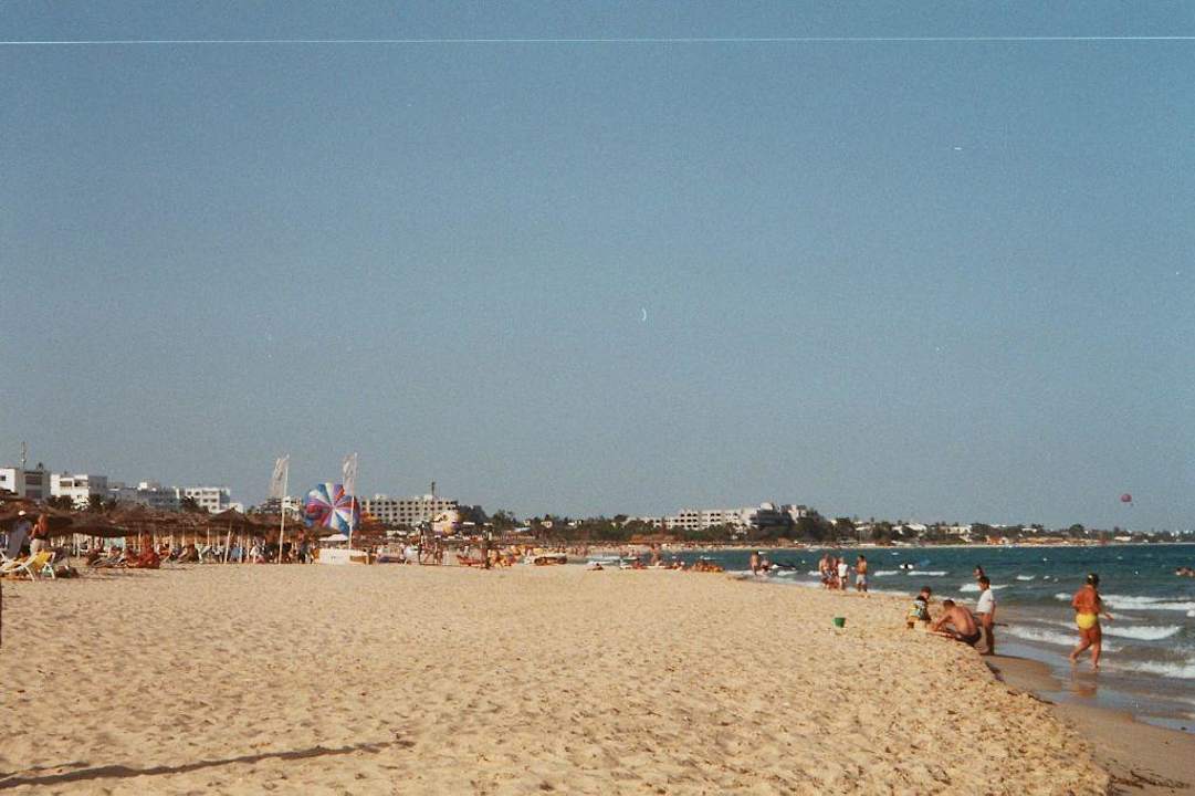 Plage au pied de l hotel belle etendue de sable parasol pour chercher de l ombre
