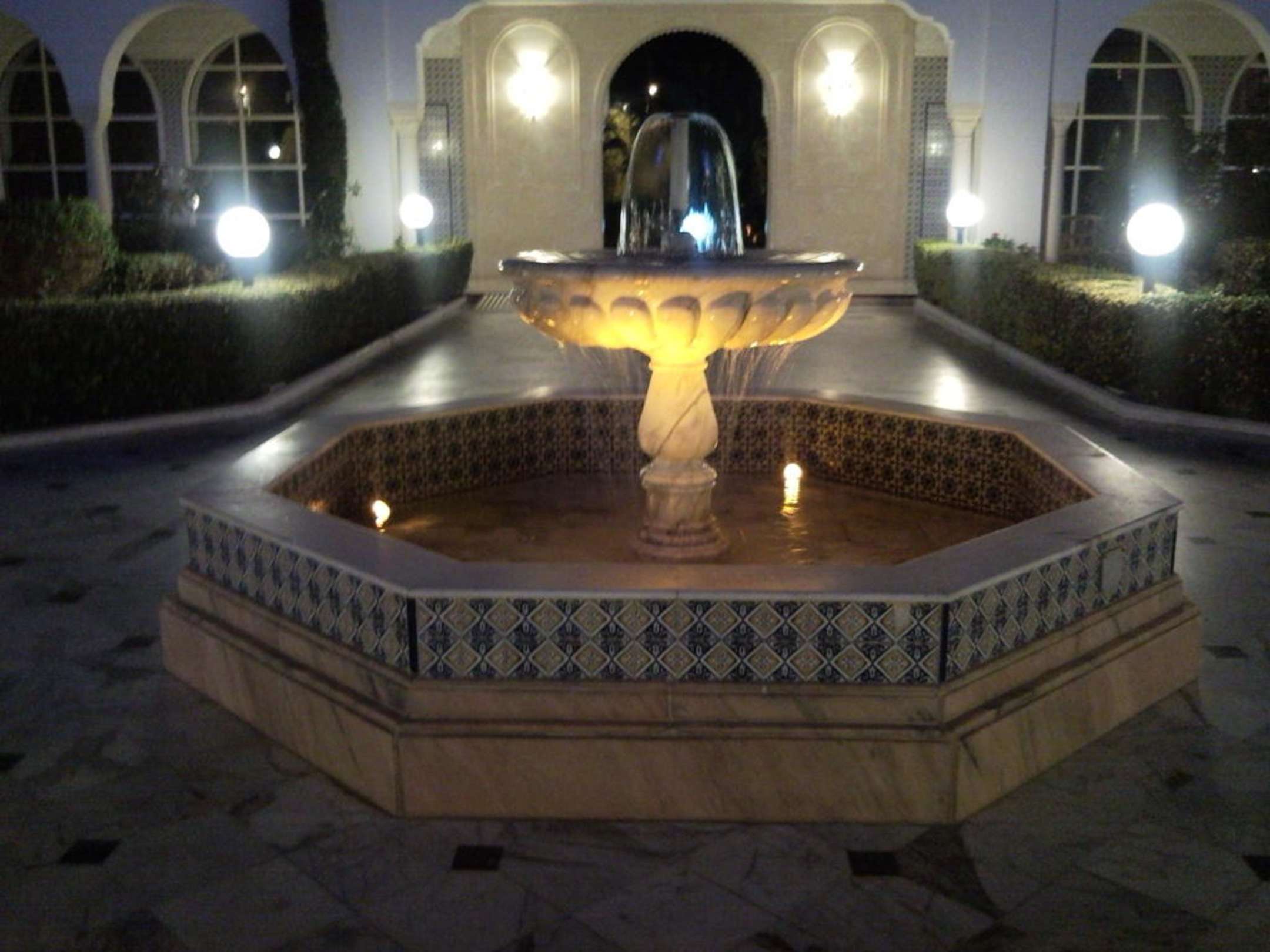 Der Brunnen vor dem Eingang in der Nacht