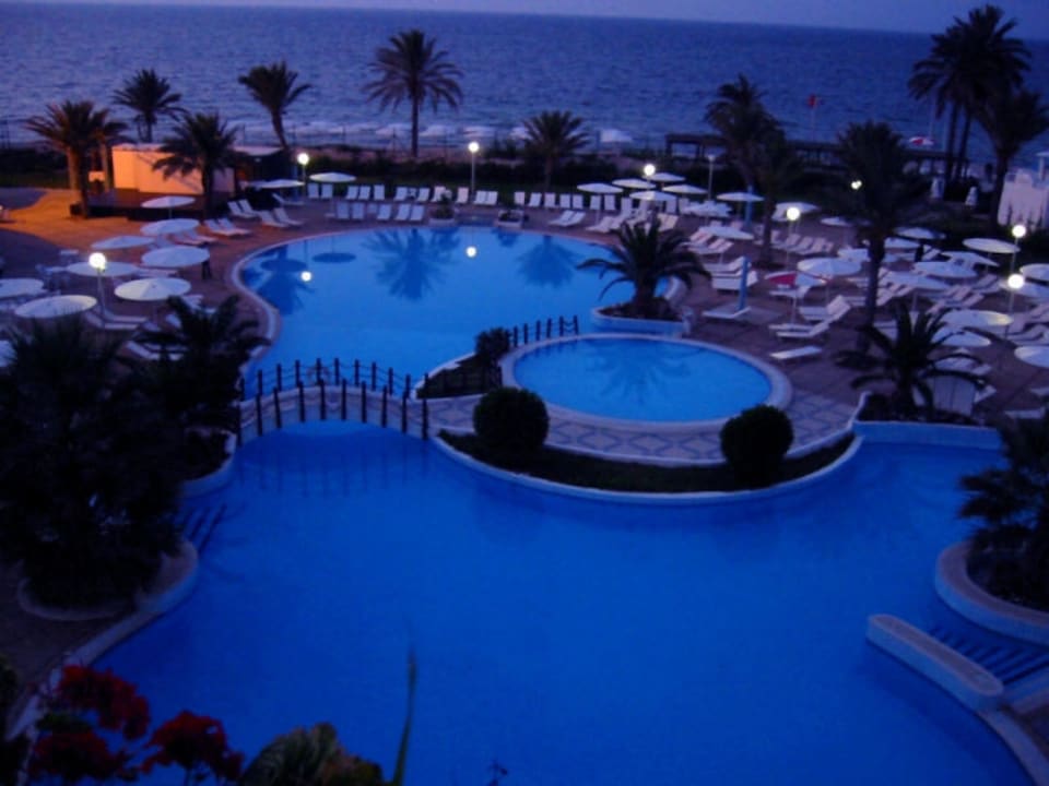 Abenddämmerung mit Blick auf Pool und Meer