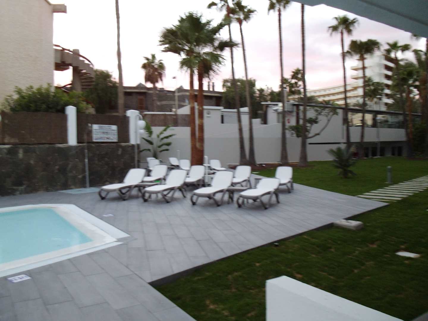 Poolanlage mit Liegen vorne bei den Appartmentterrassen