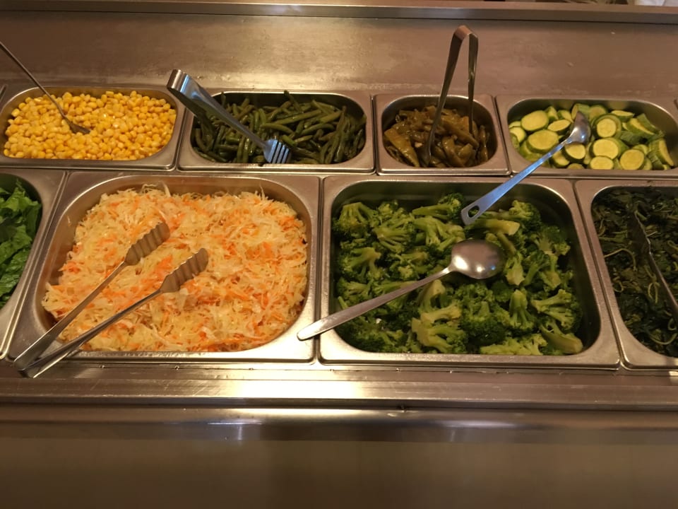 GastroAbendbuffet: Mais, grüne Bohnen, Zuckererbsenschoten, Karotten-Krautsalat, Brokkoli. Alles fantastich gut gemacht.
