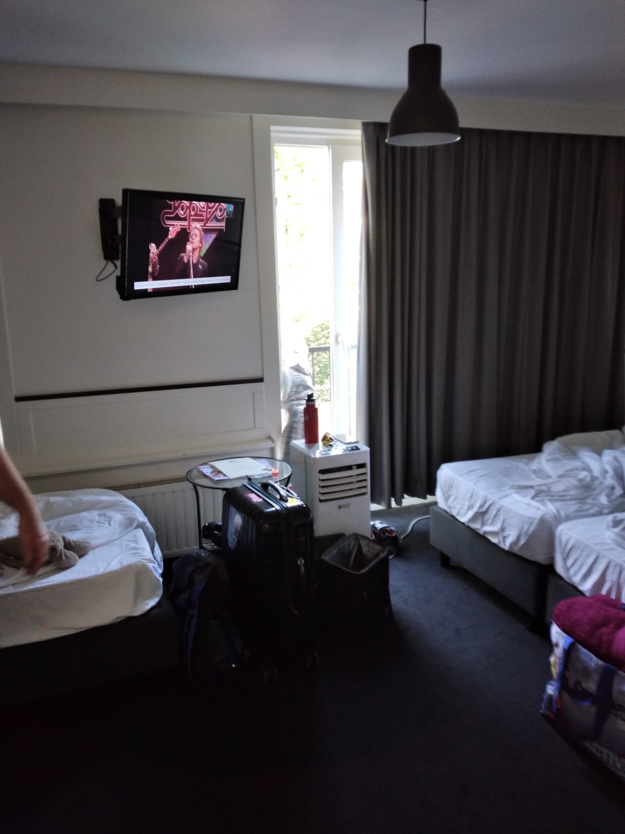 Mit Klimaanlage mit Schlauch nach draußen.