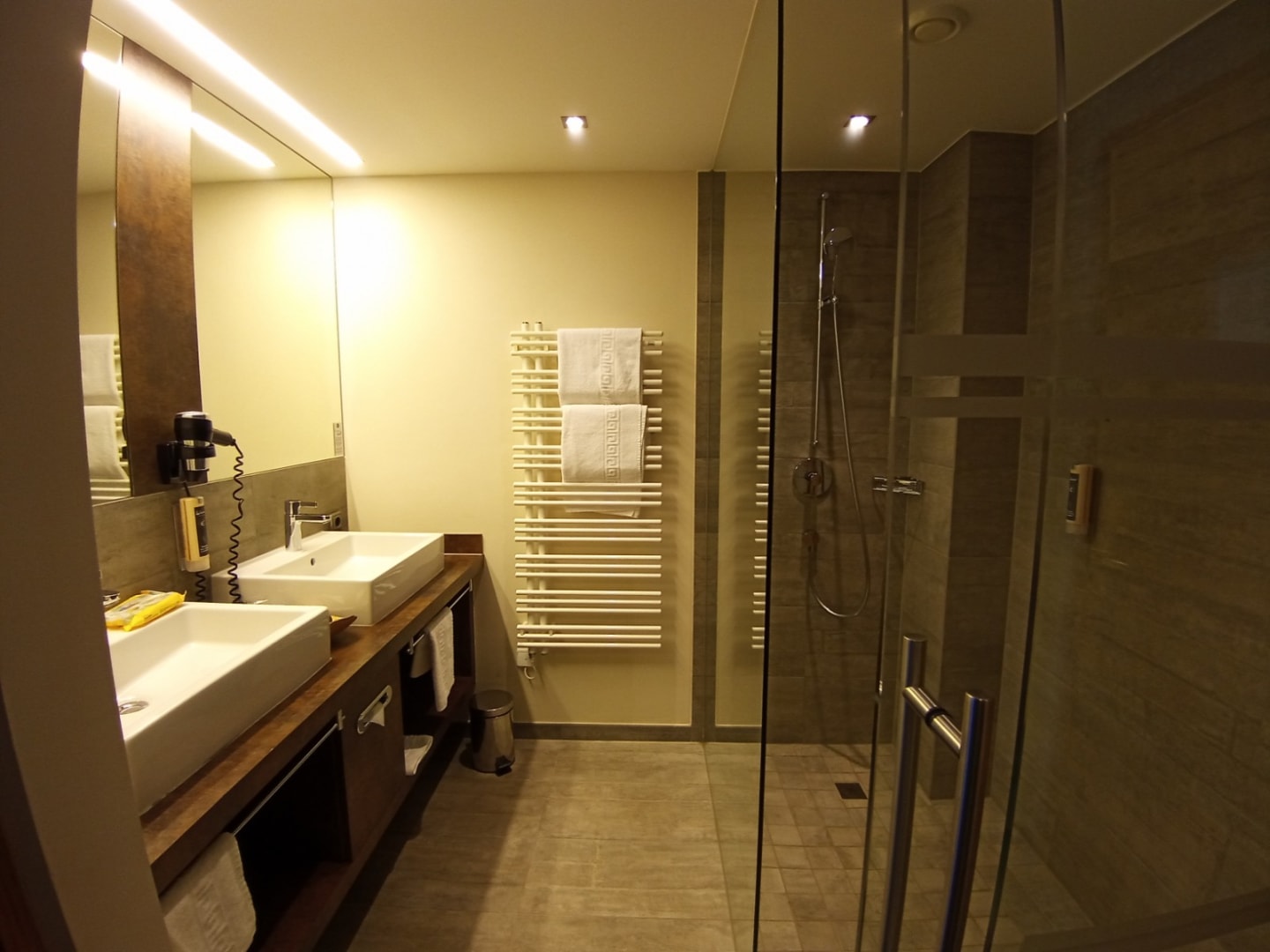 ZimmerGeräumiges, modernes Bad. 2 große Waschbecken. Große Glasdusche. Großer Handtuchtrockner. WC ist separat gegenüber.
