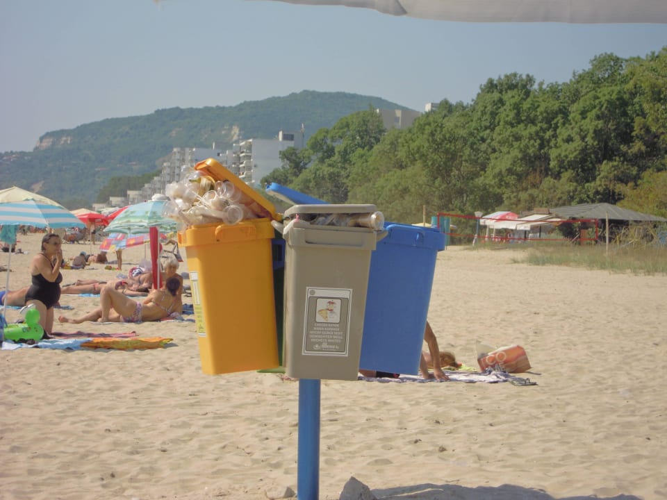 Überfüllte Abfallbehälter am Strand