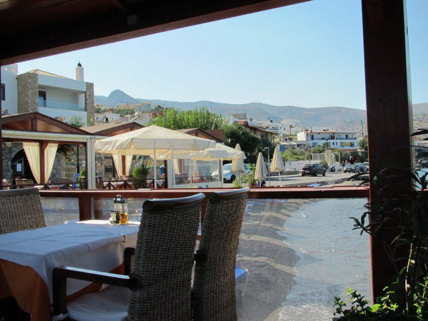 Suche den StrandAuf's Meer hinaus hat es eine Restaurant-Terrasse. Von dieser aus sieht man den Hotelstrand.