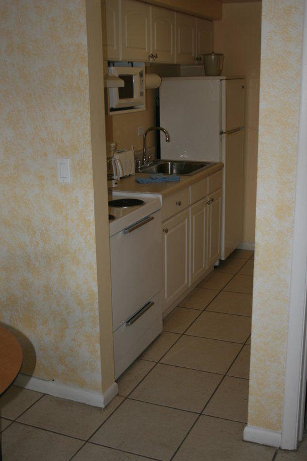 Private Entrance Suite 201, KücheDie Küche der außen liegenden Private Entrance Suite mit Herd, Microwelle, großem Kühlschrank mit Gefrierteil, ...