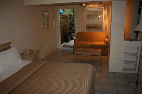 Zimmer 115, Blick zur EingangstärBlick vom bequemen Bett zum Wohnbereich mit Sofa und Eingangstür. Das Zimmer liegt zum Gartenbereich hin.