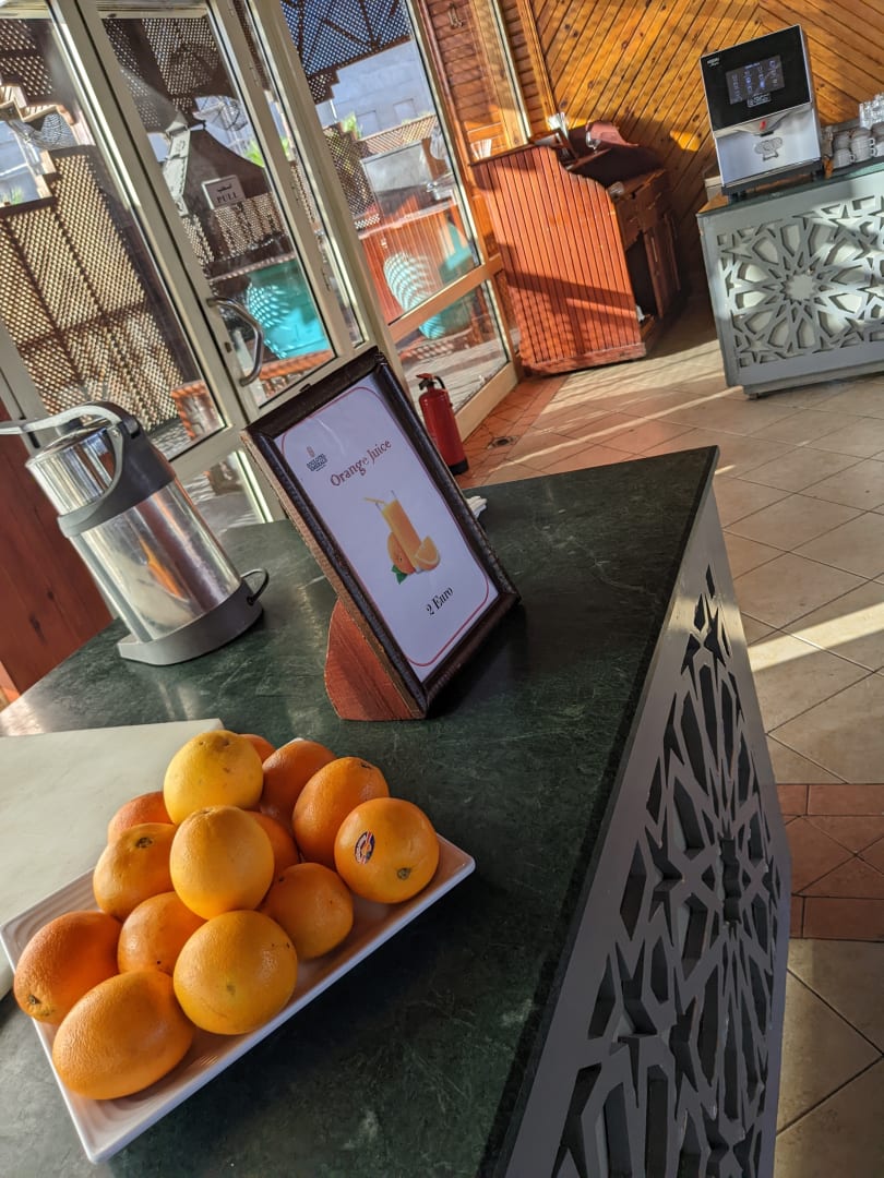 Man kann sich für 2 Euro einen frischen Saft zum Frühstück pressen lassen