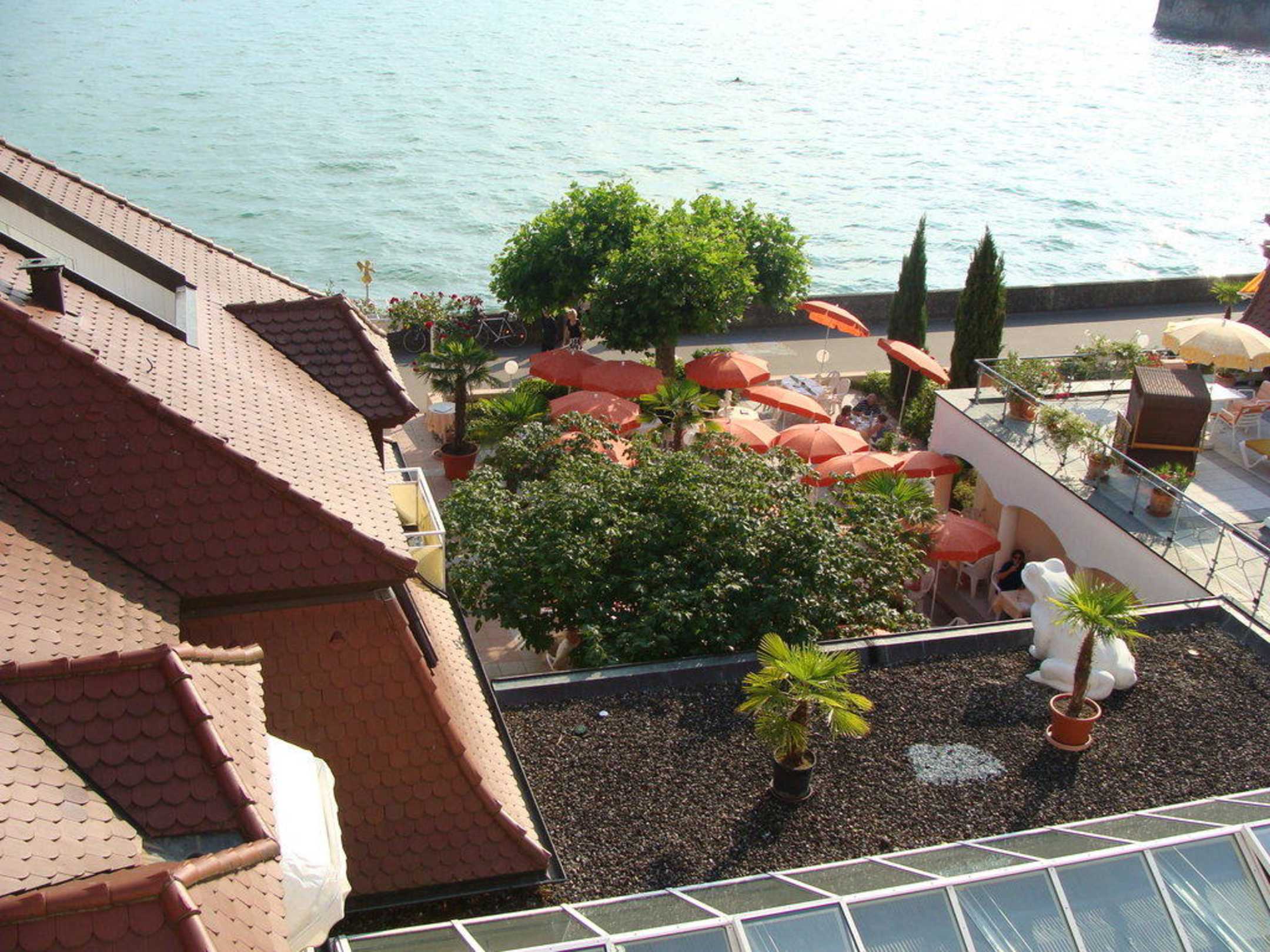 Uitzicht vanop ons balkon naar het restaurant terras.