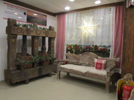 Holzbank und antike Weinpresse