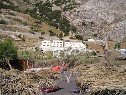 Das Hotel Epavlis ist vom Strand aus gut zu sehen. Vom Strand geht man ab hier ca. 15 Min Bergauf. Runter gehts natürlich schneller