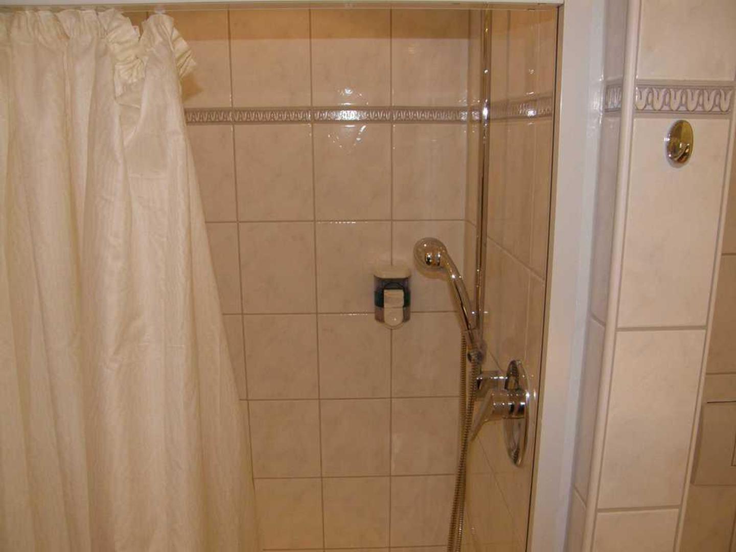 Dusche und -VorhangEin teilweise abgerissener und nicht vollständig schließender Duschvorhang passt nicht zu einem 4***-Sterne-Hotel