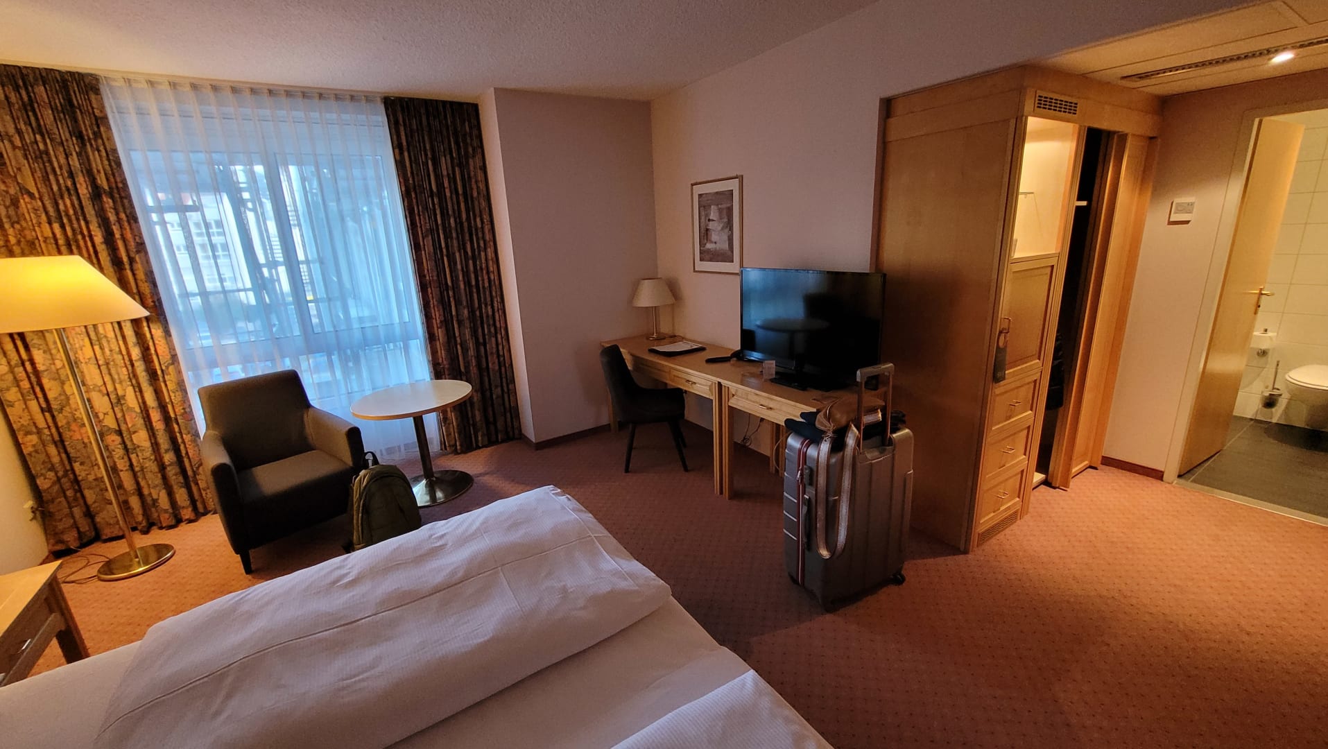Zimmer 201, Blick zum Schreibtisch, Schrank und Bad.