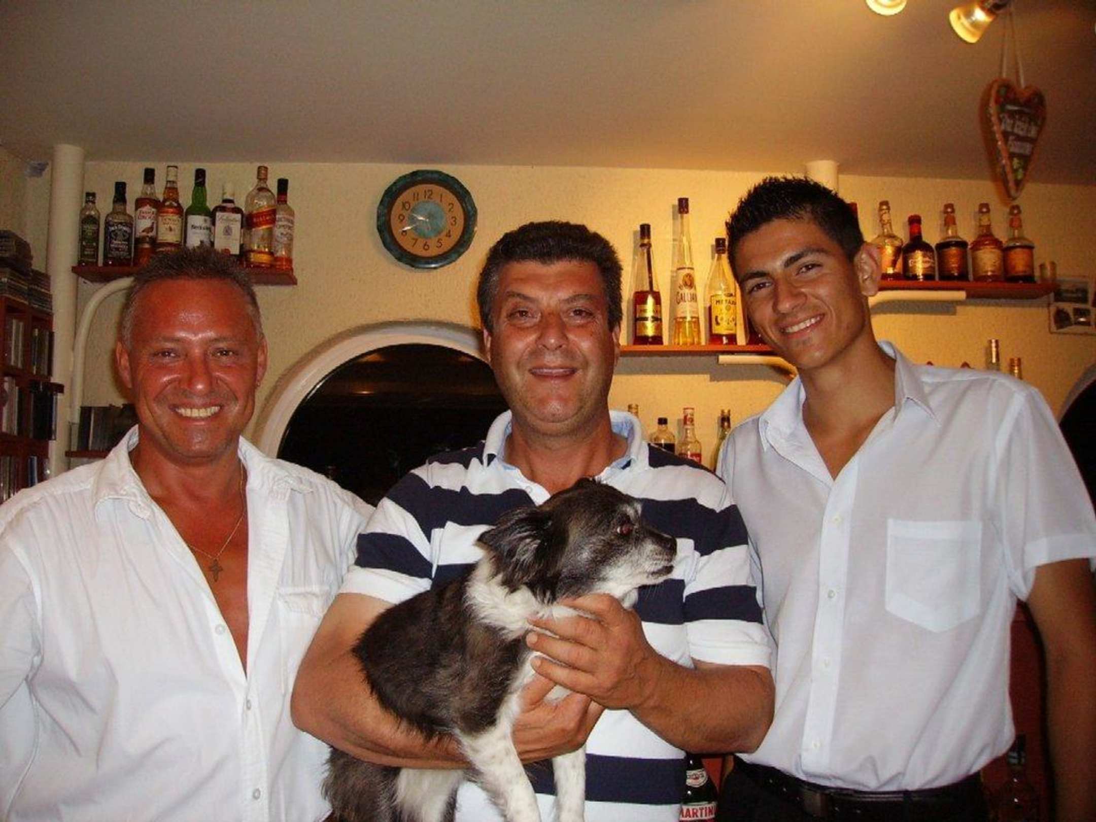 Barkeeper Mike, Big Boss Pavlo mit Hund Mikcho (wie auch immer auf griechisch) und Kellner Ermal