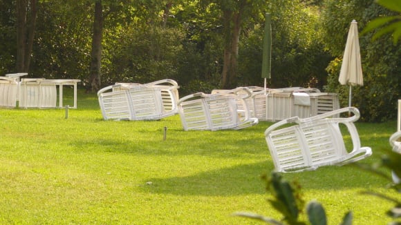 Liegewiese am Pool mit umgekippten LiegenRasen wird des nachts gesprengt. Zum Trocknen werden die Liegen dann umgekippi, jedoch nicht wieder umgedreht. Dies muß der Gast selbst erledigen. Wenn nicht alle Liegen belegt sind, bleiben diese dann den ganzen Tag über auf der Seite liegen.