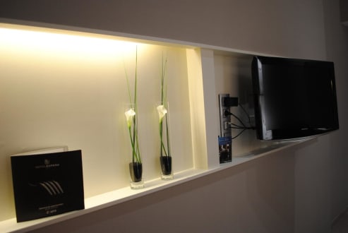Schwenkbarer (in Richtung Couch) Flat-TV.