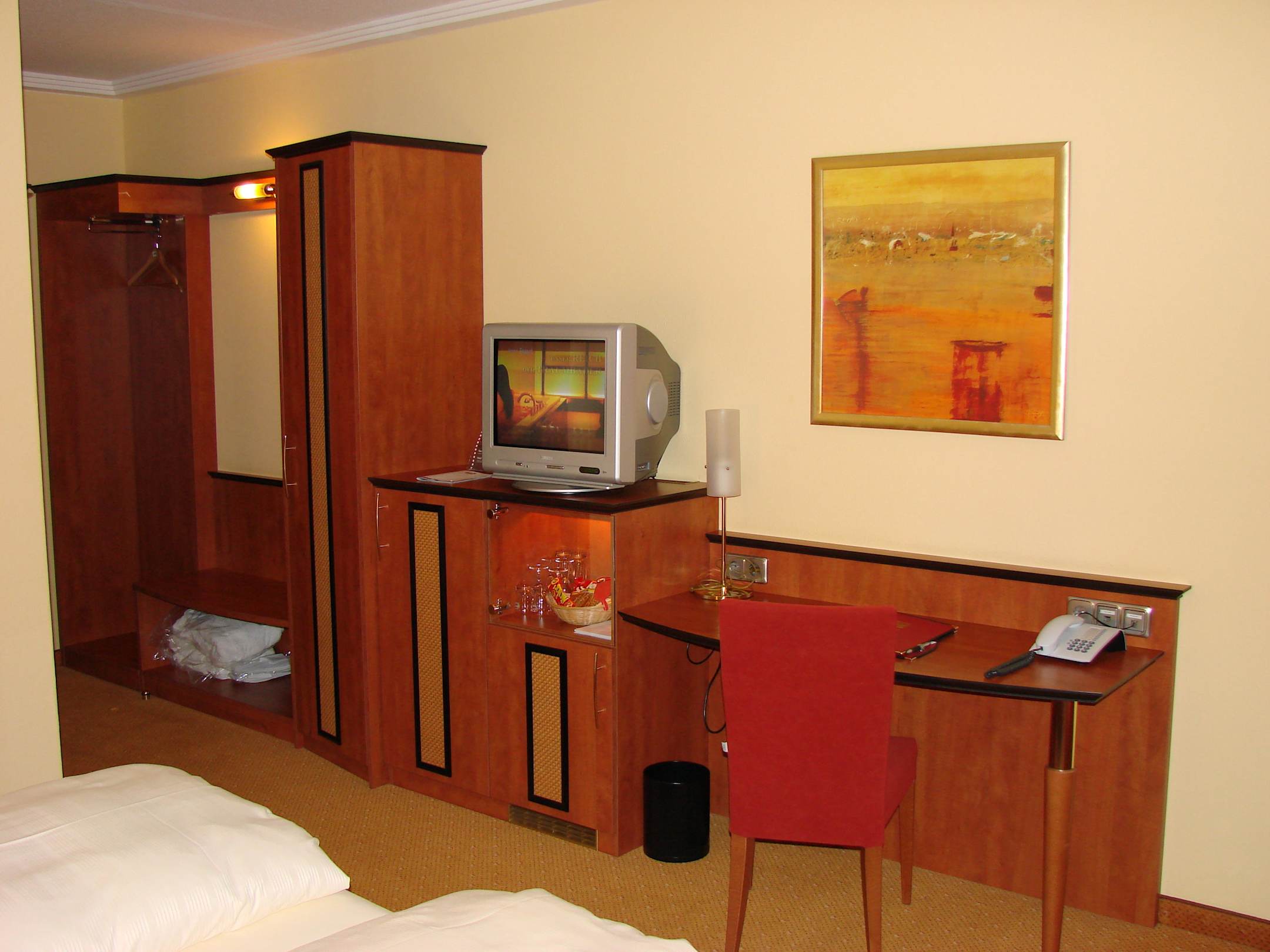 mit TV, Schrank und Schreibtisch
