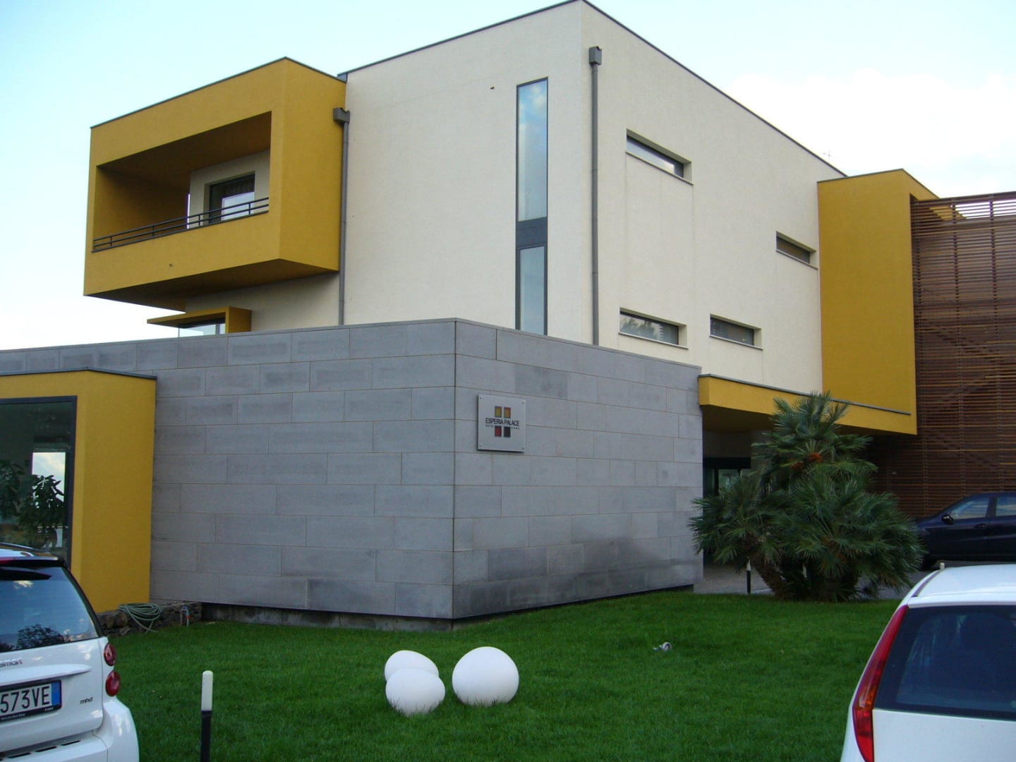 Rückseite des Hotels mit Eingang + Parkplatz