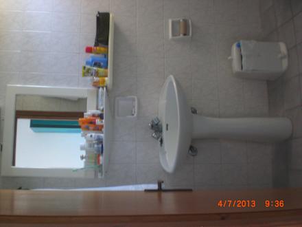 Blick ins Bad, einzige Ablageflächen die zwei Bretter unter dem Spiegel.