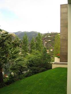 Blick von der Terrasse über den Hotelgarten zu den Bergen