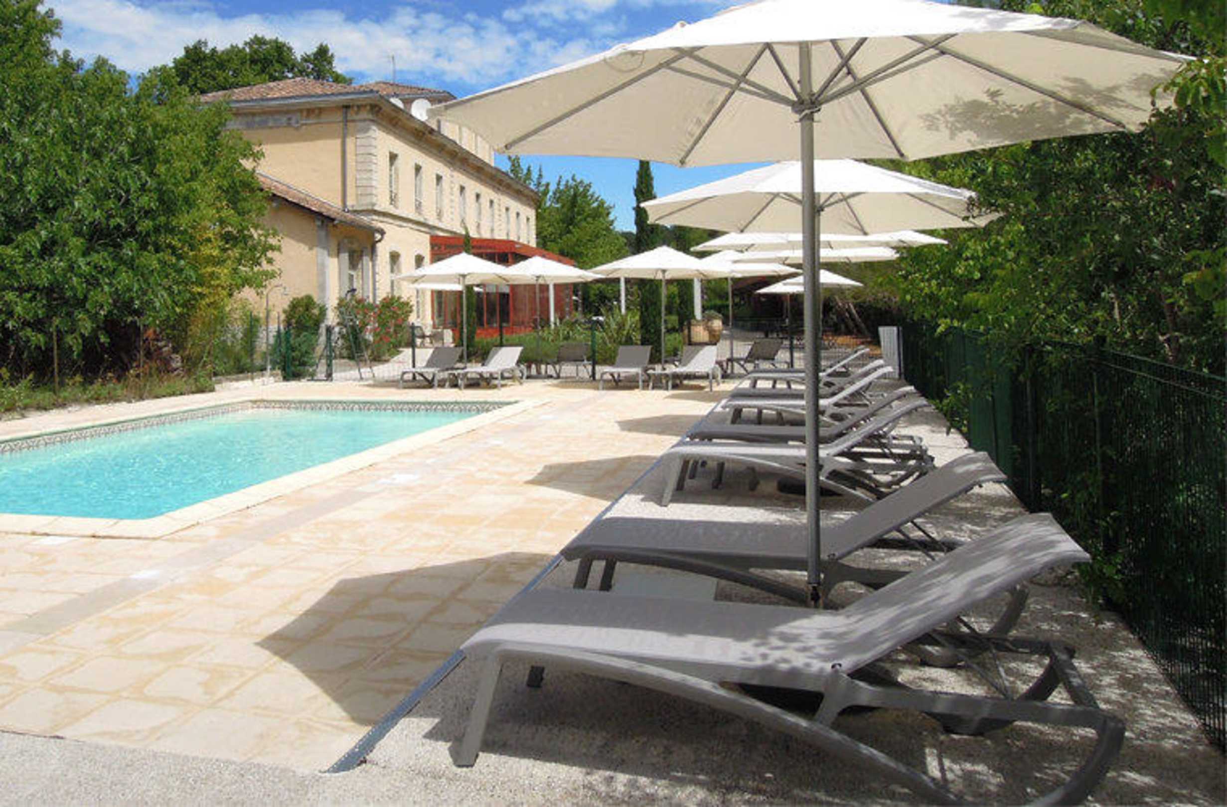 Espace piscine au milieu du jardin de l'hôtel