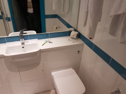 Das ausreichend große, nicht abschließbare Badezimmer.