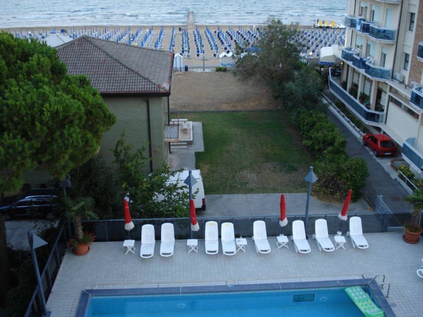 Blick vom Balkon auf den Hotelpool und den Strand