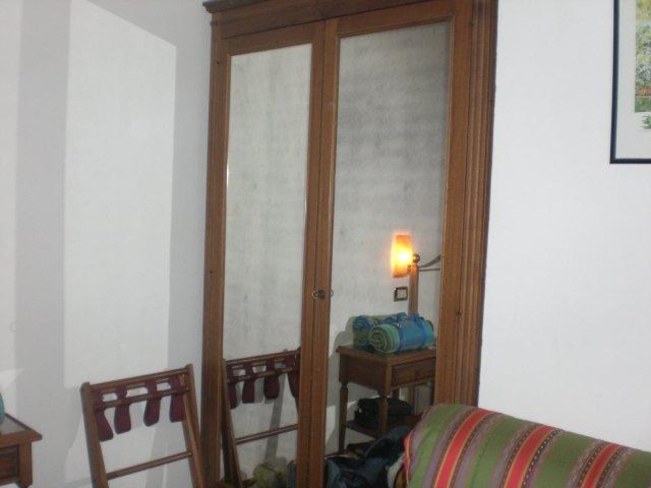 Der alte Schrank mit den angelaufenen Spiegelnlinks neben dem kleinen Gestell beginnt bereits das Bett