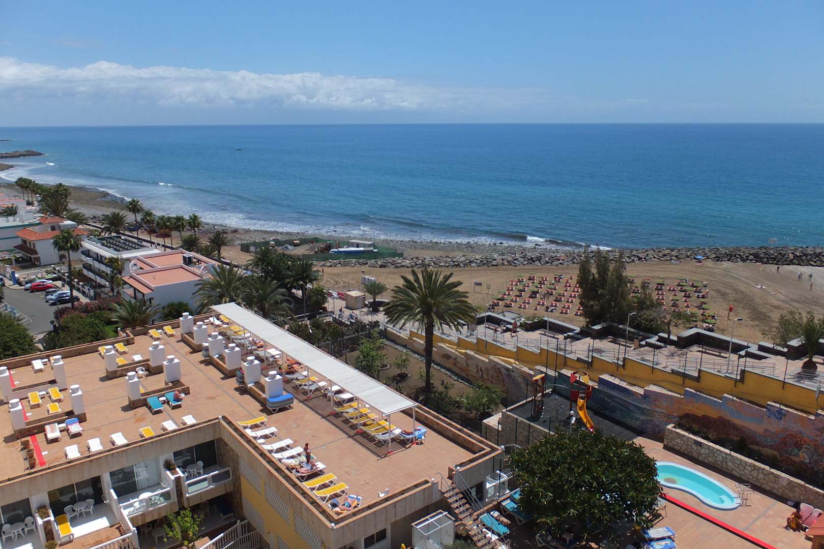 Blick auf Sonnenterrasse, Strand und Meer