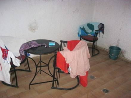 Balkon w piwnicy Widok z balkonu na drugi budynek. wiadro do którego lała się woda z klimatyzacji.A gdy sprzątaczki opróżniały wiadra z góry (wylewając wodę z balkonu)woda znajdowała się na naszych rzeczach które suszyłyśmy.Gdyż wszystko leciało do nas na balkon.