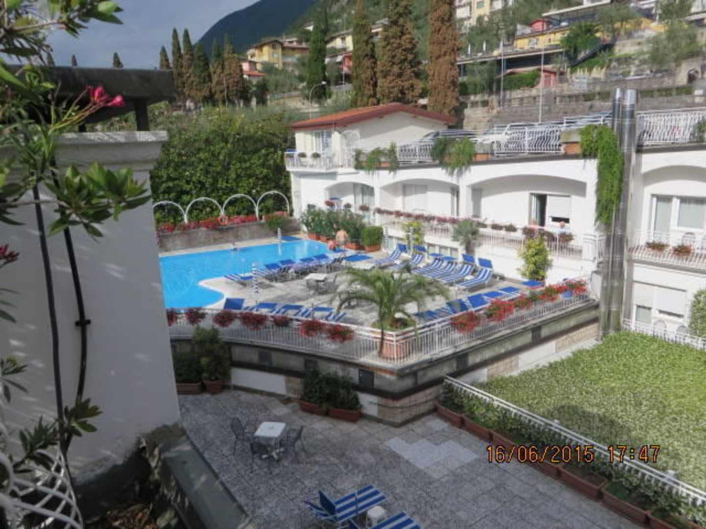Blick auf Pool und Gartenanlage