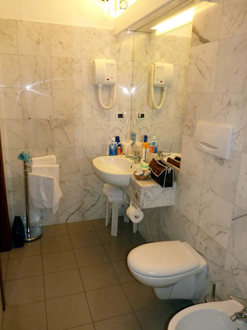 Das edle, mit Marmortafeln gekachelte Bad