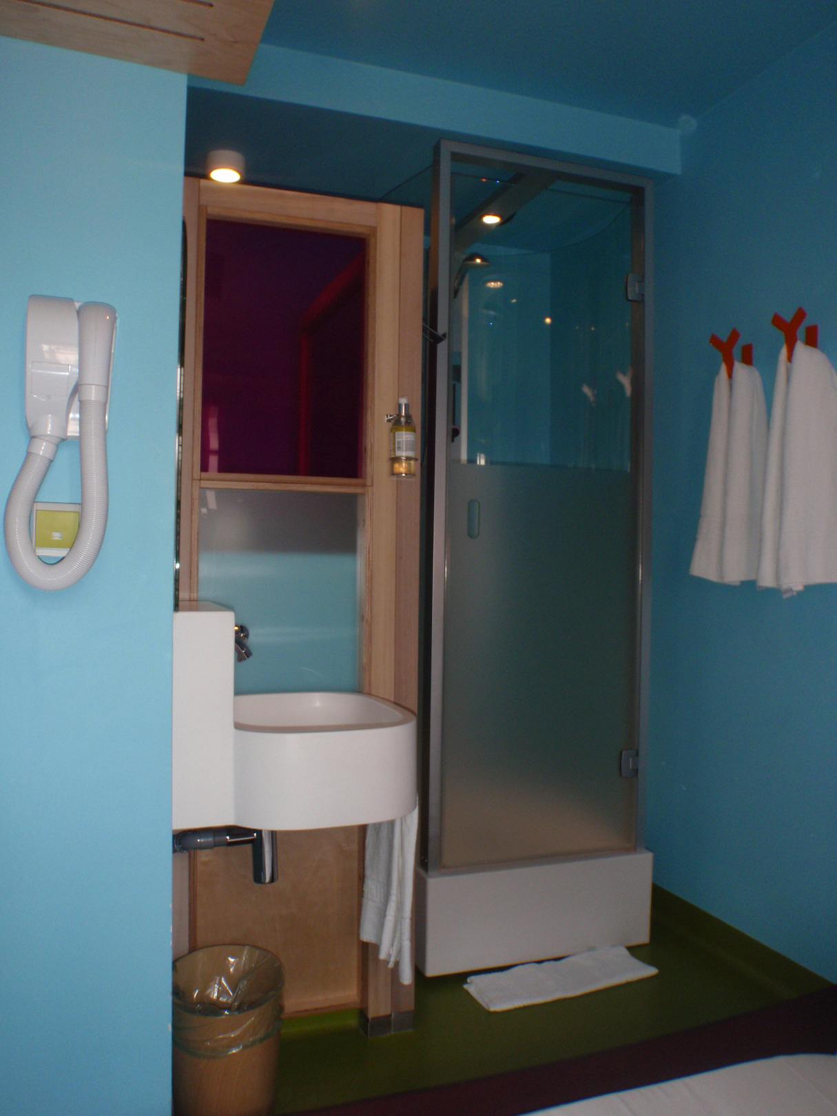Wie man sehen kann, ist das WC nach oben hin offen und das Milchglas der Dusche reicht bei großen Menschen auch nur bis knapp über den Bauchnabel :-)