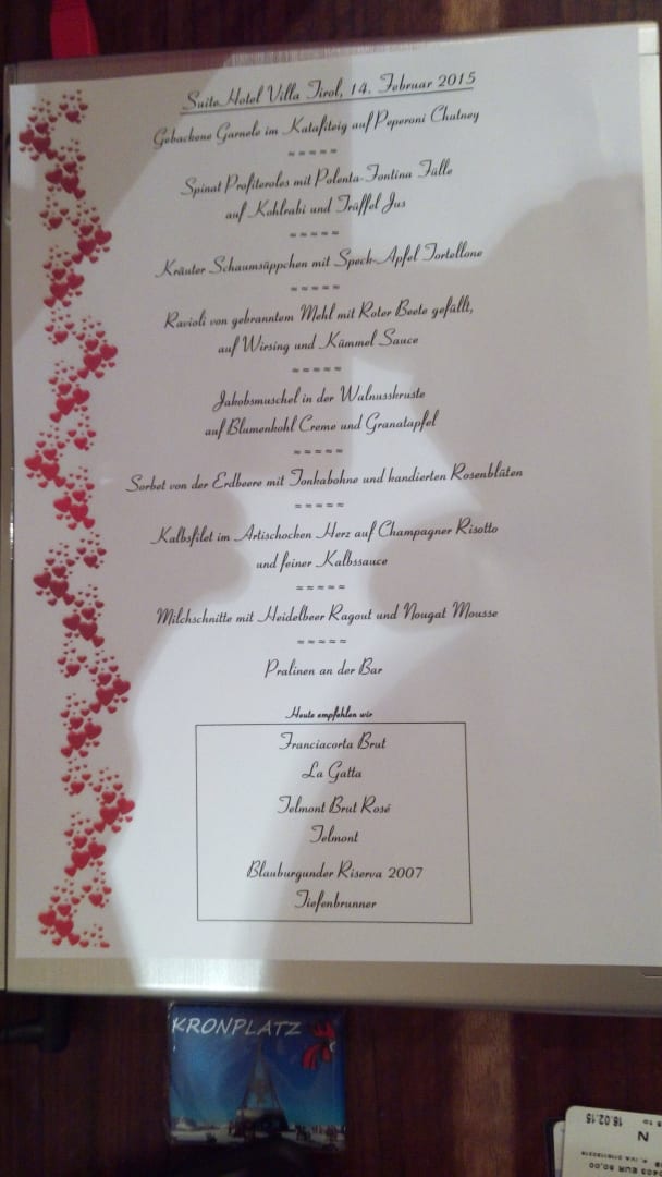 Menufolge zu Galamenu am Valentinstag Hotel Fameli