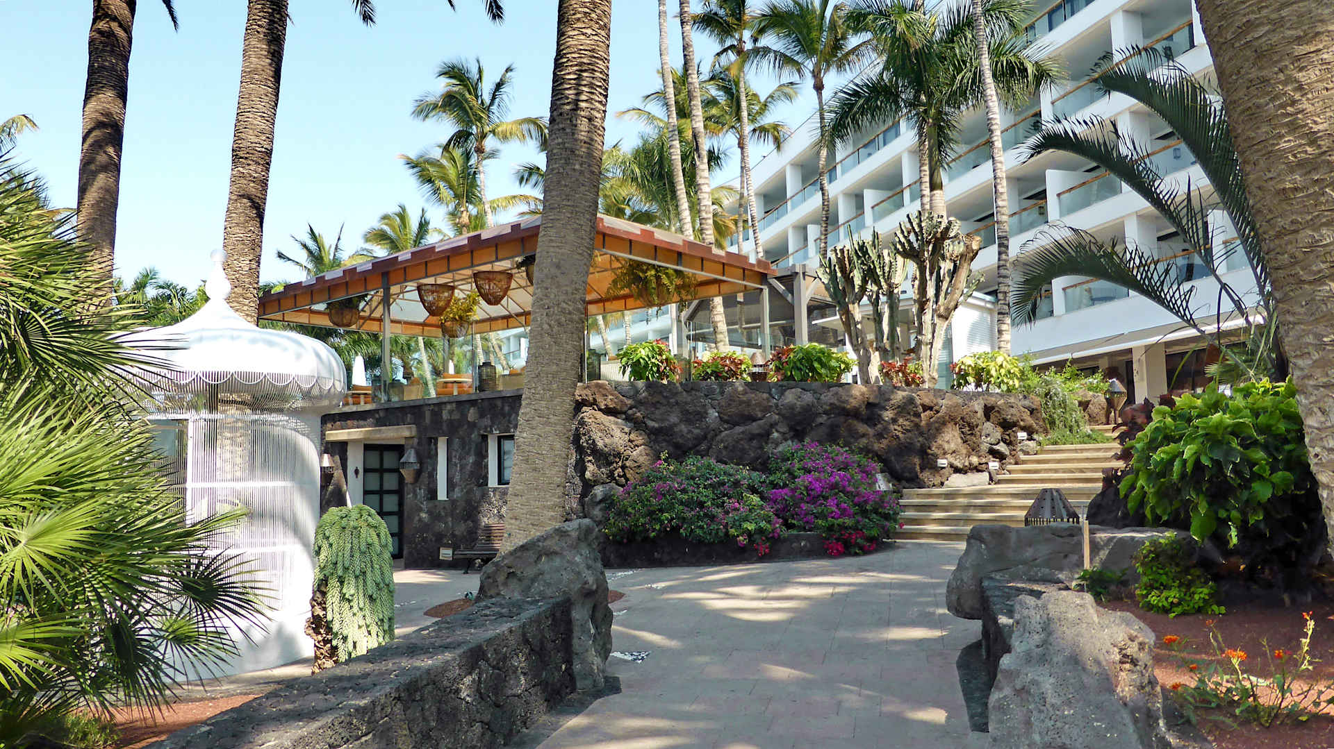 Aufgang zum Pool Blick auf Pavillon mit Eisdiele