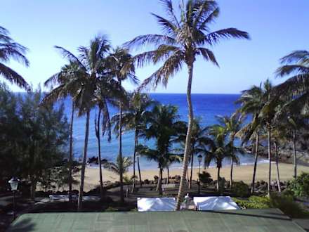 Blick vom Zimmer-Balkon aúf den Hotelpark, Hotelstrand und Fuerteventura.