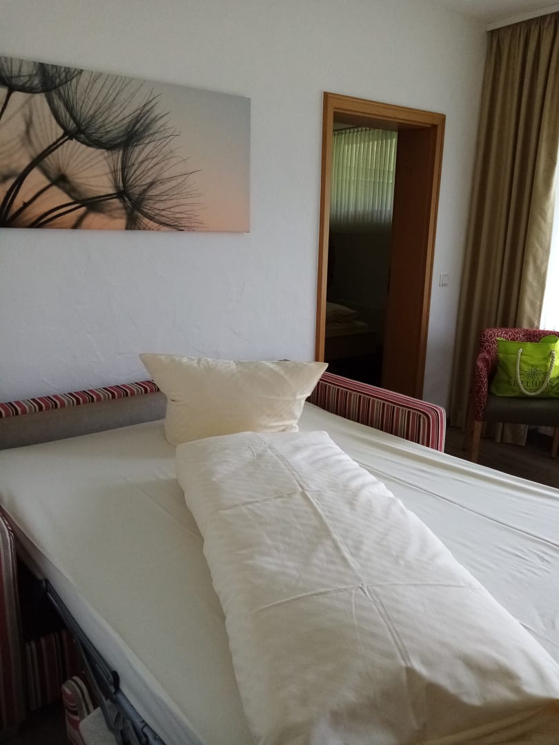 Wohnzimmer mit Schlafcouch-im Hintergrund das Doppelzimmer