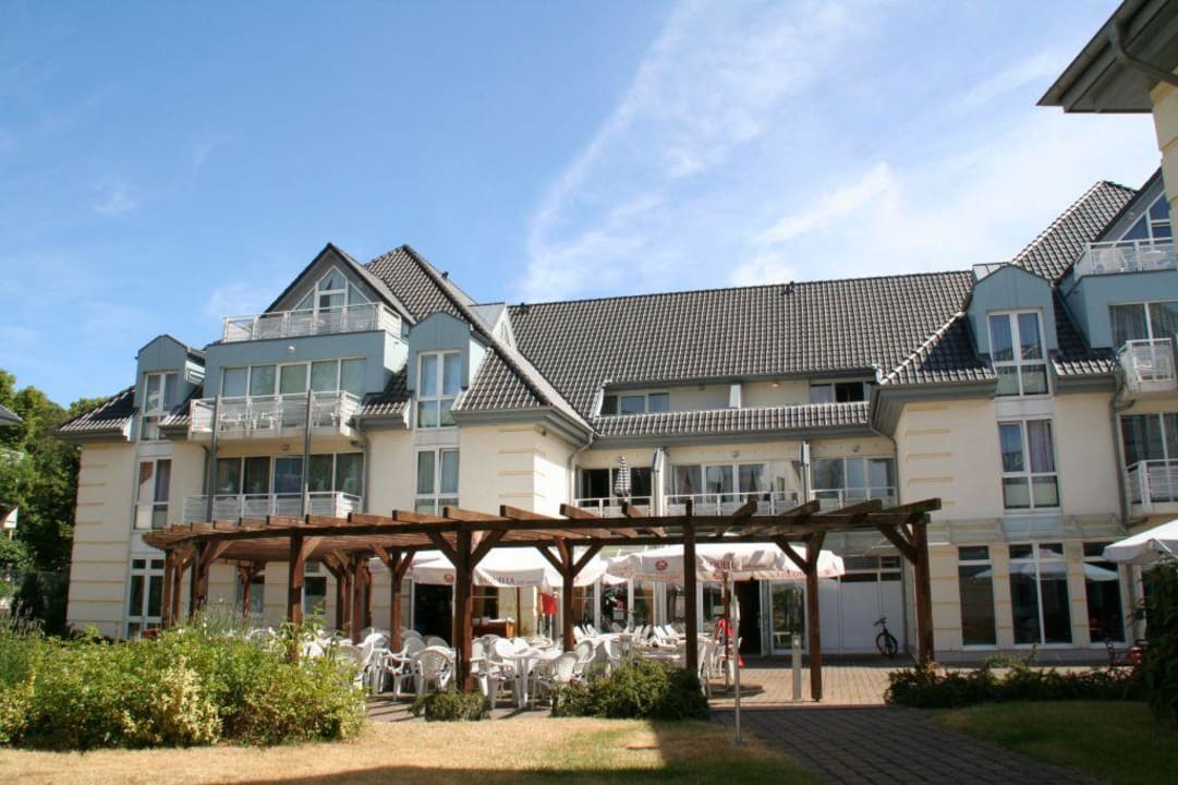 Innenhof Residenz SeesternIm Innenhof der Residenz Seestern in Boltenhagen sind zahlreiche Tische verschiedener Gastronomiebetriebe untergebracht.