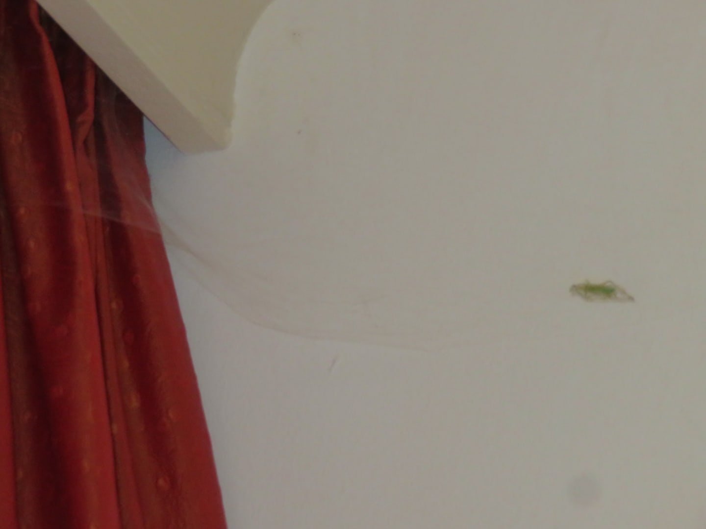riesiges Spinnennetz mit totem Grashüpfer im Zimmer