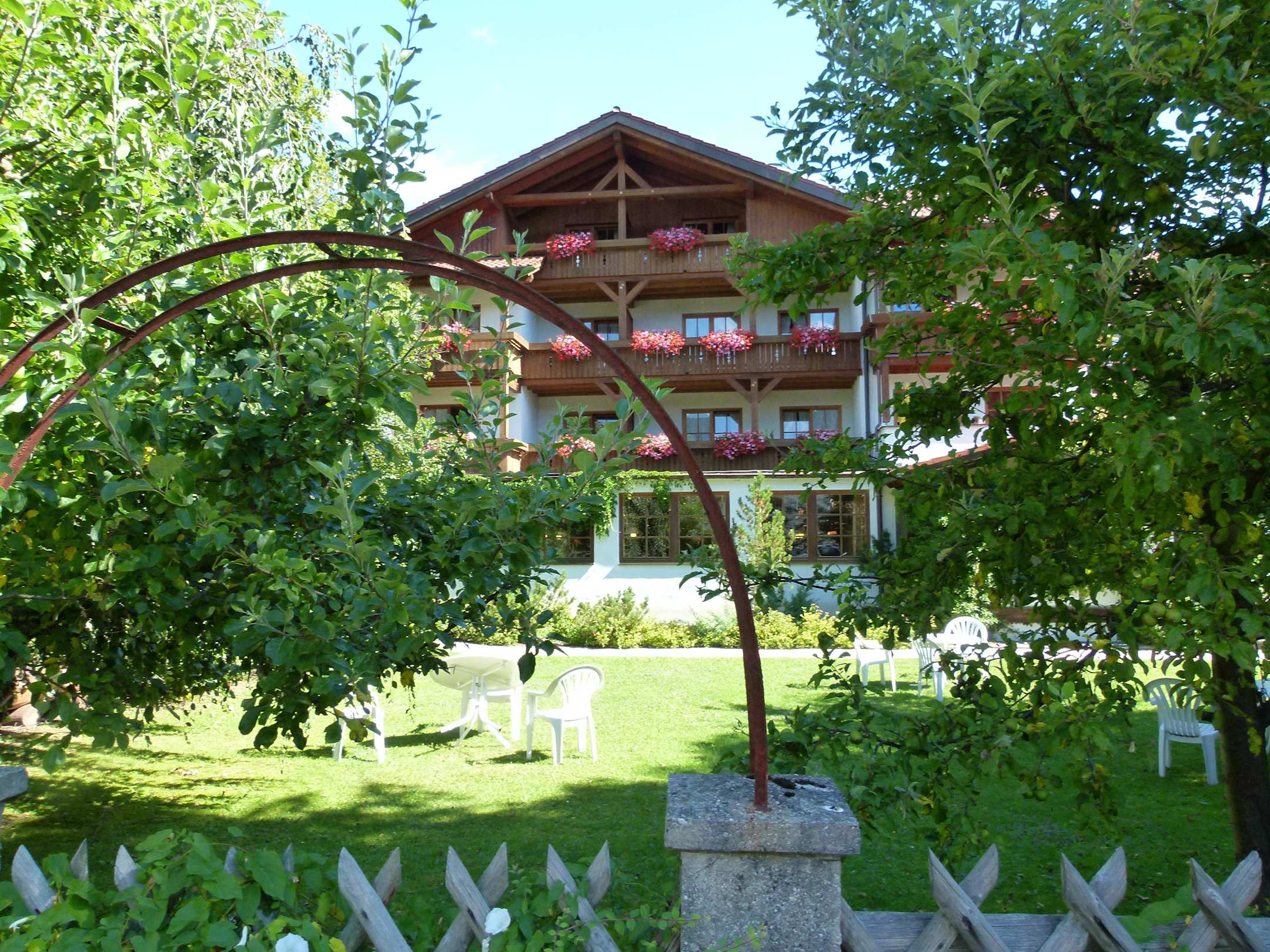 Blick vom Garten auf das Hotel