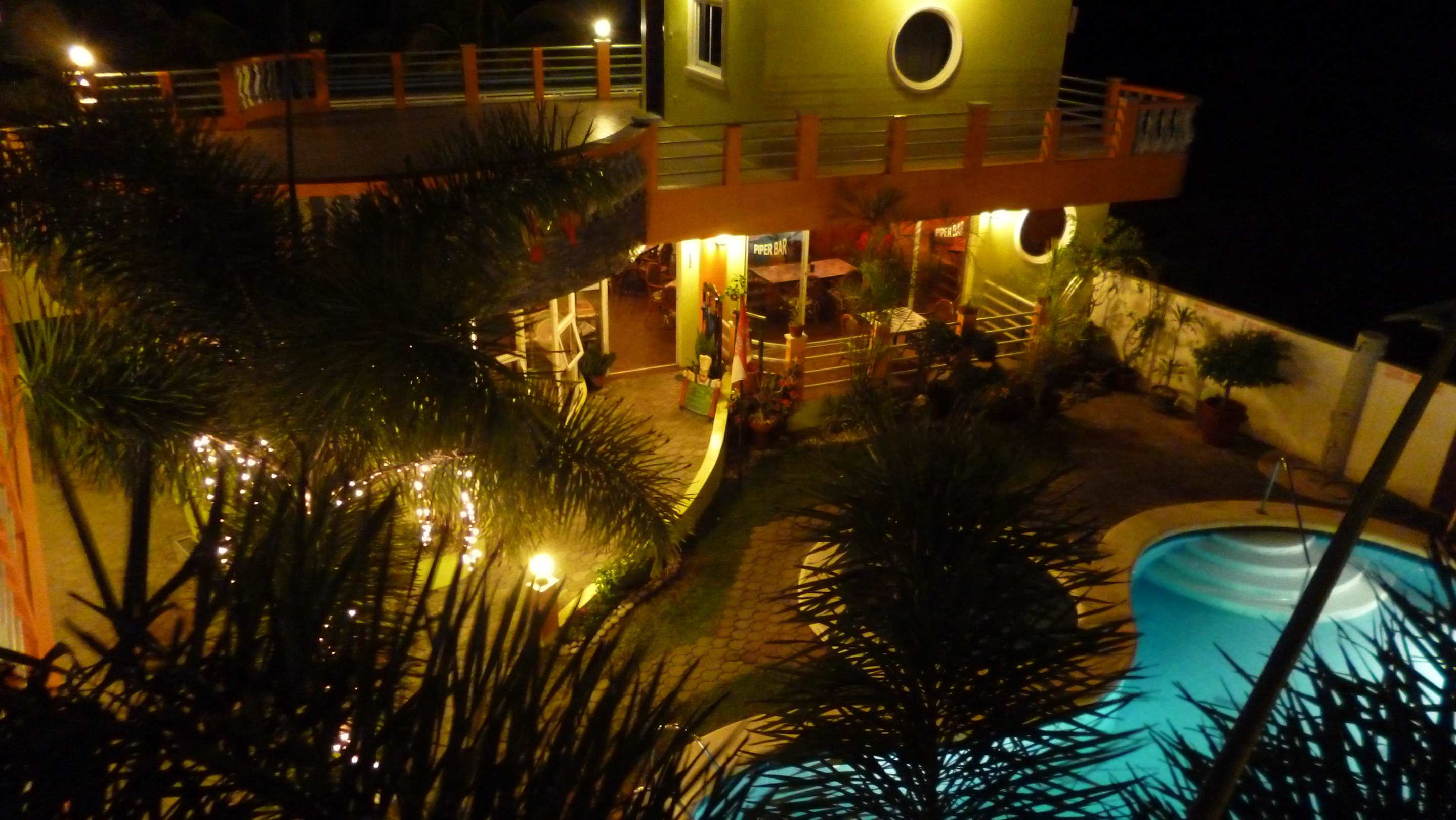 Pool, Whirlpool und Bar bei Nacht.