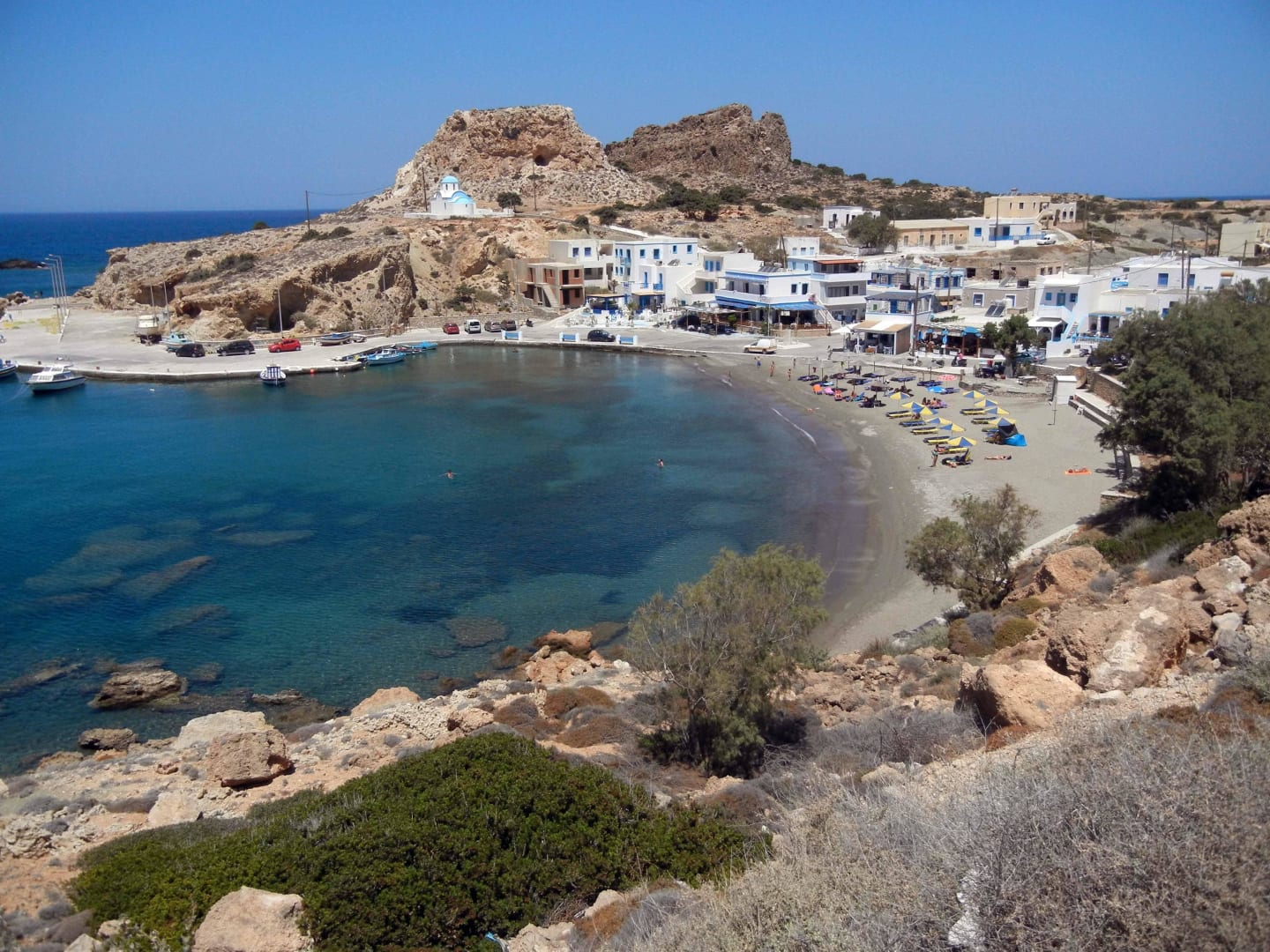Finiki von obenVon der Durchgangsstraße Arkassa-Lefkos aus gesehen (nahe vom Hotel). Blick auf den Hafenstrand mit den direkt angrenzenden Tavernen